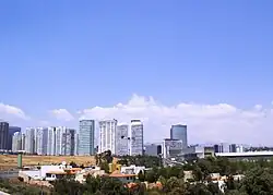 Top: Santa Fe economic district; Middle: Former Municipal Palace, La Marquesa Park, Parish of Purísima Concepción Tlacopac; Bottom: Chimalistac Park, Murano Towers