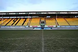 To accommodate increasing interest in the club following good results during the early 1970s, the board approved a new grandstand on the east long side. Construction started in late 1973, with the stand covering two-thirds of the length of the pitch, and opened ahead of the 1974 season with a capacity for 1,056 spectators. The clubhouse was expanded to 200 square meters (2,200 sq ft). In 1974, the club won promotion to the First Division, and the new grandstand was extended by 352 seats. On the west side, two wooden and steel-standing terraces were built. The expansion was done with help of volunteer work, with 30 to 40 people helping each weekday evening and up to 80 people helping at the weekends.[2]