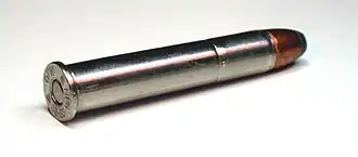 The .38-55 Winchester / 9.6x53mmR cartridge (actually .3775 caliber), also known as the .38-55 WCF and the .38-55 Ballard,[4] is a centerfire rifle cartridge. It was based on an earlier cartridge called the .38-50 Ballard Everlasting that was introduced in 1876 by the Ballard Rifle & Cartridge Company. The .38-55 Ballard was originally a Black-powder cartridge as used in Ballard and Marlin Firearms from 1876 onwards for various single-shot target rifles. Their 1893 lever-action rifle was also available in 38-55 using a Black-powder only barrel, or another barrel designated "Special Smokeless Steel" capable of safely using 38-55 cartridges loaded with the then relatively new and higher pressure smokeless powders. It was later offered by Winchester in its Model 1894, who usurped the name calling it the 38-55 Winchester, although it was an exact dimensional copy of the 38-55 Ballard. Winchester continued to use the round in various rifles until about 1940, and also used it in a few commemorative editions of rifles since then. In addition, Marlin offered it in some 336s, and it was used in non-lever action rifles such as the Remington-Lee bolt-action.[5][6] The .38-55 Winchester is also the parent case for the .30-30 Winchester, .32 Winchester Special, and the .375 Winchester cartridges.[7]