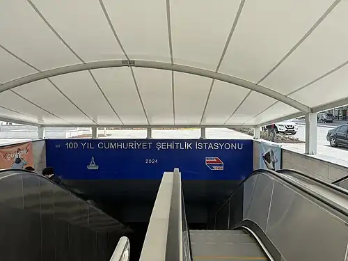 100. Yıl Cumhuriyet Şehitlik is an underground station on the M1 Line of the İzmir Metro in Narlıdere. Located under Mithatpaşa Avenue, it has one island platform servicing two tracks. The station was opened on 24 February 2024, after almost 6 years of construction.