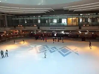 In addition to its office space and shopping areas, it includes a full-size indoor ice skating rink, a physical fitness centre, a bus terminal (the Downtown Terminus) serving city and commuter buses to certain South Shore communities, and links to other underground city buildings, Central Station, Lucien-L'Allier Station and the Bonaventure Metro station.