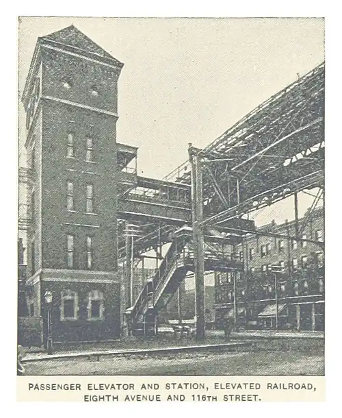 The 116th Street station was an express station on the demolished IRT Ninth Avenue Line in Manhattan, New York City. It had three tracks and two island platforms. It opened on September 17, 1879, and closed on June 11, 1940. The next southbound local stop was 104th Street station until June 3, 1903, and then 110th Street. The next southbound express stop was 66th Street. The next northbound stop was 125th Street for all trains. The express run from this stop to 66th Street was the longest express segment out of all New York City elevated lines, bypassing seven local stations.