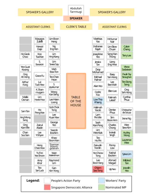 The 11th Parliament of Singapore was the previous Parliament of Singapore. The first session commenced on 2 November 2006 and was prorogued on 13 April 2009. The second session commence from 18 May 2009 and was dissolved on 19 April 2011.[1] The membership was set by the 2006 Singapore General Election on 7 May 2006, and it has changed twice due to the deaths of Jurong GRC MP Dr Ong Chit Chung in 2008, and Ang Mo Kio GRC MP Balaji Sadasivan who was also the Senior Minister of State for Foreign Affairs.