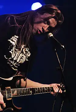 Pekka and Antti took turns recording their rhythm and lead guitar parts, respectively.[9] Both guitarists played by striking the guitar strings at a 45-degree angle to achieve a more aggressive sound.[5] Several of the guitar techniques used on the album had specific names: "Jynkhä" described the rapid succession of downstrokes,[10] and a slower version of this technique was called "perusjynkhä."[11] Speed-picking with alternating upstrokes and downstrokes was referred to as "hionta",[12] Finnish for grinding. Some of the techniques used were difficult for Pekka, and his brother Antti took the time to show him proper fingering and grasps.[9]