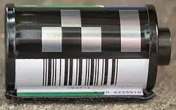 This modern film canister uses DX encoding; it is marked with a six-digit barcode which embeds the DX number below a silver-and-black conductive DX Camera Auto Sensing pattern.