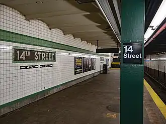 The 14th Street/Sixth Avenue station is an underground New York City Subway station complex in the Greenwich Village and Chelsea neighborhoods of Manhattan, on the IRT Broadway–Seventh Avenue Line, the BMT Canarsie Line and the IND Sixth Avenue Line. It is located on 14th Street between Sixth Avenue (Avenue of the Americas) and Seventh Avenue. It is served by the 1, 2, F, and L trains at all times, by the 3 train at all times except late nights, the M train during weekdays, and the <F> train during rush hours in the peak direction.