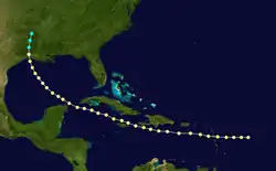 The fourth tropical cyclone of the season, also the longest-lasting, was first observed on September 6 to the east of the Lesser Antilles.[2] A small cyclone, it tracked westward and struck Guadeloupe as a fully developed hurricane. Many residents in the small nearby island of Marie-Galante evacuated to Guadeloupe, but some died in the attempt. In Îles des Saintes, the hurricane destroyed all but two buildings. Damage was similarly heavy in Basse-Terre. The overall death toll was estimated at 300, including 36 on Marie-Galante.[1] After moving through the Lesser Antilles, the hurricane moved through the Caribbean Sea, passing between Jamaica and Haiti and bypassing Cuba to the south. It curved northward in the Gulf of Mexico,[1] moving ashore on September 13 near the border between Texas and Louisiana with an estimated atmospheric pressure of 969 millibars (28.6 inHg).[9]