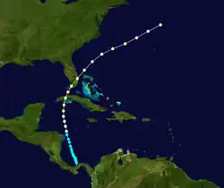 The final tropical cyclone of the season formed on October 18, just north of the coast of Panama. The storm brushed the country's coast with high waves for several days, causing $300,000 in damage (1865 USD).[1] Moving north-northwestward, the storm intensified into a hurricane by October 21 over the western Caribbean. After turning more to the north, it struck Cuba, producing strong winds that destroyed the roof of the Belen College Observatory in Havana. In the city, the hurricane destroyed several boats and houses. A station on the island recorded a pressure of 975 mbar (28.8 inHg),[1] suggesting winds of about 80 mph (130 km/h).[2]