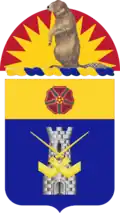 That for the regiments and separate battalions of the Oregon Army National Guard: On a wreath of the colors Or and Azure, a demi-disc Gules charged with the setting sun with twelve light rays Or (the shoulder sleeve insignia of the 41st Division), behind a beaver sejant Proper. Motto "Custodes Portae Occidents" (Guardians of the Western Gates)
