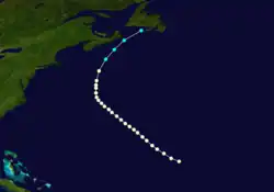 Although the steamer Antonio Lopez may have encountered this storm as early as September 11, a track could not be constructed as far back as that date because the location of the ship was not logged.[15] Instead, the Atlantic hurricane database (HURDAT) initiates the track as a Category 1 hurricane about 900 mi (1,450 km) northeast of the Lesser Antilles on September 16.[3] Reports from the ship Harley John and an unnamed vessel indicated the cyclone possessed sustained winds of 80 mph (130 km/h).[10][3] The hurricane moved generally northwestward for a few days until turning northward on September 20. Curving northeastward on the following day, the cyclone weakened to a tropical storm on September 22 before being last noted several hours later just offshore Newfoundland's Burin Peninsula.[3]