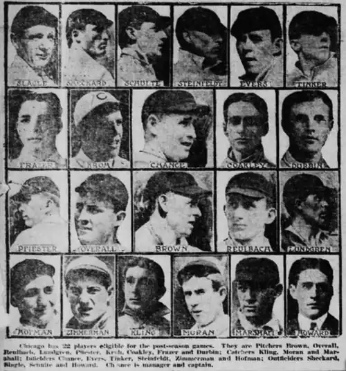 On September 26, starting pitcher Ed Reulbach became the only pitcher in Major League Baseball history to pitch two shutouts on the same day. That day, the Cubs played a doubleheader against the Brooklyn Dodgers. Reulbach pitched both games to completion, which the Cubs won by scores of 5–0 and 3–0.[6]