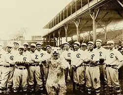 The 1908 Chicago Cubs season was the 37th season of the Chicago Cubs franchise, the 33rd in the National League, and the 16th at West Side Park. It involved the Cubs winning their third consecutive National League pennant, as well as the World Series for the second consecutive year. This team included four future Hall of Famers: manager / first baseman Frank Chance, second baseman Johnny Evers, shortstop Joe Tinker, and pitcher Mordecai Brown. In 1908, Brown finished second in the NL in wins and earned run average. This would be the last World Series victory for the Cubs until 2016; it would also take until 2003 – an MLB and North American professional sports record of 95 years – for the Cubs to win their next playoff series.