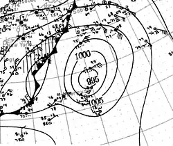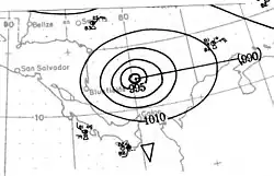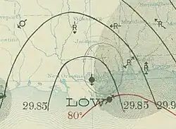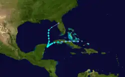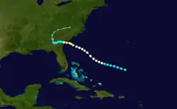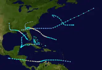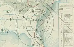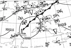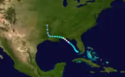 The final storm was first observed as a disturbance near Puerto Rico in the Caribbean Sea in late October.[17] The disturbance was the precursor to a tropical depression which developed over the southern Bahamas and headed west-southwestward across Cuba,[1] where, at Havana, winds blew from the southeast at 44 mph (71 km/h).[17] It became a tropical storm on October 27 and drifted southwestward. Near the eastern tip of the Yucatán Peninsula, the storm turned sharply northward.[1] An area of high pressure over the United States prevented the cyclone from turning eastward toward Florida, and it continued into the Gulf of Mexico. However, on October 31, the storm curved eastward and moved ashore over northern Florida. The storm decreased in intensity as it passed into the Atlantic.[17] The storm's circulation center remained poorly defined throughout its course. It was long believed to have developed south of Cuba, although a reevaluation of ship data indicated the depression had actually formed east of the island.[2] On October 26, the Weather Bureau hoisted hurricane warnings along the east coast of Florida from Key West to West Palm Beach, and on the west coast up to Tampa.[18]