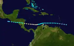The next storm formed well to the east of the Lesser Antilles on September 3 and moved westward, attaining tropical storm status about a day later. The storm slowed and curved toward the southwest, nearing the northern coast of Colombia before pulling away from land and strengthening into a hurricane. It further intensified to Category 2 status before striking Nicaragua on September 10. Quickly weakening to a tropical storm, the cyclone continued westward across Central America and briefly entered the eastern Pacific Ocean. It dissipated shortly thereafter.[1] In the town of Corinto, a report indicated the deaths of 10 people and 50 additional injuries. About 250 houses were destroyed, leaving approximately $2 million (1911 USD, $67.5 million 2014 USD) in damage.[16] Data on this storm is extremely scarce; as such, only minor revisions could be made to its chronology in the hurricane database.[2]