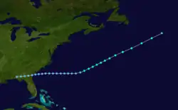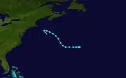 The fifth official tropical cyclone of the year was also previously unknown until contemporary reassessments. It exhibited some hybrid characteristics, and may have qualified for subtropical cyclone status according to the modern classification scheme.[2] On September 15, the storm formed over the central Atlantic and initially moved westward. It gradually intensified as it turned northwestward, and on September 19 it transitioned into an extratropical cyclone southeast of New England.[1] The system was subsequently absorbed by a more powerful frontal boundary approaching from the northwest.[2]