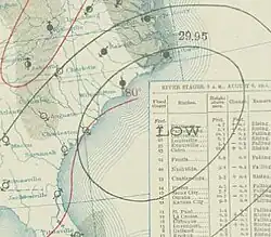 Based on ship observations in the southeastern Gulf of Mexico, a low-pressure area developed north of Key West in early August.[6] It developed into a tropical depression at 12:00 UTC on August 8,[3] and strengthened into a tropical storm at 06:00 UTC on August 9 while moving northwestward off the west coast of Florida.[3] Gradual intensification continued, and at 06:00 UTC on August 11 the storm strengthened to hurricane status.[3] At 22:00 UTC on August 11, the hurricane reached its peak intensity and concurrently made landfall near the border between Alabama and Florida as a small tropical cyclone.[6] During this time, the storm's maximum sustained winds were estimated at 80 mph (130 km/h), making it the equivalent of a Category 1 hurricane on the modern day Saffir–Simpson hurricane wind scale.[3] A lull in the storm accompanied the nearby passage of its eye before conditions once again deteriorated.[7] Although the lowest barometric pressure measured on land was 1007 mbar (hPa; 29.74 inHg) in Pensacola, Florida, the storm's pressure was estimated to be much lower at 982 mbar (hPa: 29.00 inHg).[6] After making landfall, the hurricane weakened and slowly drifted westward, weakening to a tropical depression over Louisiana on August 13, before dissipating over Arkansas by 12:00 UTC the next day.[3]