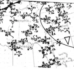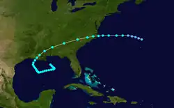A trough of low pressure in the northeastern Gulf of Mexico developed into a tropical depression about 60 mi (100 km) west-southwest of Cedar Key, Florida, on September 10.[4] Shortly thereafter, the depression intensified into a tropical storm. Moving generally westward, the storm intensified into a Category 1 hurricane on the modern day Saffir–Simpson scale early on September 12. The cyclone peaked with maximum sustained winds of 90 mph (150 km/h) at 00:00 UTC on September 13,[5] observed by a ship.[4] Around this time, the hurricane began to curve northwestward. While approaching the Gulf Coast of the United States, the system weakened. At 08:00 UTC on September 14, the hurricane made landfall near Pascagoula, Mississippi, with winds of 75 mph (120 km/h).[5] A barometric pressure of 986 mbar (29.1 inHg) was observed at landfall, the lowest known in relation to the cyclone.[4] The system quickly weakened to a tropical storm just four hours after landfall. Early on September 15, the storm weakened to a tropical depression and dissipated over Tennessee.[5]