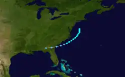 In late September, a cold front moved into the Gulf of Mexico. By October 3, a low pressure associated with the front developed.[4] Initially extratropical, the low moved east-northeastward and crossed Florida on October 4. After entering the Atlantic early on October 5, the low began strengthening and soon reached the equivalency in intensity to a tropical storm. Around 00:00 UTC on October 6, the system transitioned into a tropical cyclone while situated about 260 mi (420 km) southeast of Cape Fear in North Carolina. Already a strong tropical storm, the cyclone intensified into a hurricane about six hours later. [5] Late on October 6, a vessel observed a barometric pressure of 996 mbar (29.4 inHg), the lowest in relation to the stop. Based on this, it is estimated that the hurricane peaked with maximum sustained winds of 90 mph (150 km/h).[4] The storm then began to execute a small cyclonic loop, which continued until early on October 8. By then, the cyclone was moving eastward and weakened to a tropical storm around 00:00 UTC on October 9. About 24 hours later, the system weakened to a tropical depression. At 18:00 UTC on October 10, the depression dissipated about 280 mi (450 km) northeast of Bermuda.[5]
