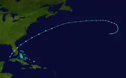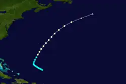 A tropical storm was first observed about 500 mi (800 km) east of the island of Trinidad on September 6. It moved nearly due westward and struck the Windward Islands on September 8 as a Category 1 hurricane. The storm moved northwestward across the Caribbean and intensified into a major hurricane on September 9. Thereafter, the cyclone began to curve northward, and early on September 11, it made landfall in the Dominican Republic near Boca de Yuma at peak intensity as a Category 3 hurricane with winds of 125 mph (201 km/h). The storm weakened to a Category 2 hurricane after striking the island, but re-strengthened into a Category 3 while northeast of the Bahamas on September 13. The storm curved northeastward on September 14 and began accelerated. On the following day, the system weakened to a Category 2 hurricane near Bermuda. Early on September 17, the system weakened to a Category 1 hurricane and soon transitioned into an extratropical cyclone about 310 mi (500 km) east of Newfoundland.[3] The remnants were absorbed by a larger extratropical storm later on September 17.[4]