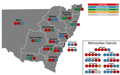 It was a close win for the Labor Party Leader, Jack Lang, which had a majority of just one seat in the Assembly, defeating Fuller's Nationalist/Progressive Coalition.[1][2][3]