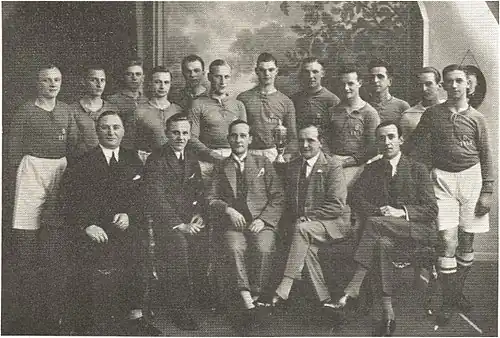 Regular team line-up of B 1913, the winners of the 1927/28-season of FBUs Mesterskabsrække, and the board members of 1928. Back row (standing from left to right): Martin Petersen, Knud Lindegaard, Harry Christensen, Poul Espe, Richard Rasmussen, Albert Fischer, Børge Jensen, Carl Hansen (nicknamed Flade Carl), Chr. Larsen, Johs. Bundegaard (reserve player), Frederik Johansen, Kaj Seebach. Front row (sitting from left to right): L.M. Fischer (vice chairman), Ejnar Hansen (treasurer), Th. Frederiksen (chairman), Alex Petersen, Steffen Henriksen.[5][3]