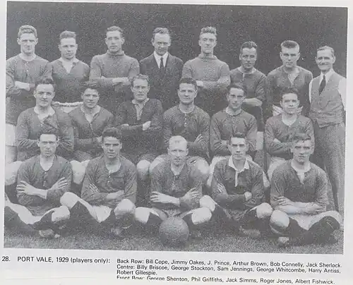 1. ^ a b c d e f g h i j k l m n o p q r s t u v w x y z aa ab ac ad ae af ag ah ai aj ak al am Kent, Jeff (1990). "From Glory to Despair (1929–1939)". The Valiants' Years: The Story Of Port Vale. Witan Books. pp. 124–150. ISBN 0-9508981-4-7.