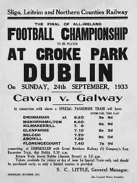 3. ^ Kenny, Tom (14 April 2011). "The men who first brought Sam to Galway". Galway Advertiser. Retrieved 14 April 2011. In 1933 Cavan beat Galway in the final by 2 – 5 to 1 – 4, but in defeat the Galway team were hailed as a major force for the future, a prediction that turned out to be accurate as they beat Dublin the following year by 3 – 5 to 1 – 9, the first Galway team to wear the maroon and white colours and the first Galway team to bring the Sam Maguire west. The crowd at the game numbered 36,143.