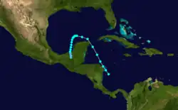 The first storm of the season formed on May 14 in the southwestern Caribbean Sea off the east coast of Nicaragua. It moved quickly to the north-northwest, passing just northeast of the eastern tip of Honduras. On May 15, the storm turned to the west and entered the Gulf of Mexico while moving around the Yucatán Peninsula. The next day, it attained peak winds of 50 mph (80 km/h), based on a ship report. Turning southward, the storm made landfall on Ciudad del Carmen in Mexico early on May 19 with winds of 40 mph (64 km/h). It dissipated over land later that day.[11]