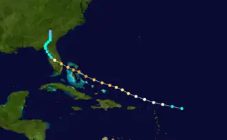 The origins of the hurricane were from a tropical wave that possibly spawned a tropical depression on August 27, although there was minimal data over the next few days as it tracked to the west-northwest. On August 31, a nearby ship reported gale-force winds, which indicated that a tropical storm had developed to the east-northeast of the Lesser Antilles. Based on continuity, it is estimated the storm attained hurricane status later that day. Moving quickly to the west-northwest, the storm passed north of the Lesser Antilles and Puerto Rico. Early on September 2, a ship called the Gulfwing reported a barometric pressure of 978 mb (28.9 inHg), which confirmed that the storm attained hurricane status.[3] After passing north of the Turks and Caicos islands,[4] the hurricane struck Eleuthera and Harbour Island in the Bahamas on September 3, the latter at 11:00 UTC. A station on the latter island reported a pressure of 27.90 inHg (945 mb) during the half-hour-long passage of the eye.[5] Based on the pressure and the small size of the storm, it is estimated the hurricane struck Harbour Island with peak winds of 140 mph (220 km/h), making it the equivalent of a modern Category 4 hurricane on the Saffir-Simpson scale. Interpolation suggested that the storm reached major hurricane status, or Category 3 status, on September 2.[3]