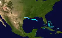 Little more than a day after the first storm of the season dissipated, a tropical depression formed on September 17 in the central Gulf of Mexico about 120 mi (190 km) north of the Yucatán Peninsula. Upon forming, the system began moving generally northward.[5] Early on September 18, the system developed into a tropical storm more than 300 mi (480 km) to the south-southeast of New Orleans, Louisiana. Over the next three days, the intensifying storm executed a gradual clockwise loop, moving to the south-southeast before turning back to the west. After intensifying to a Category 1 hurricane on September 21, the storm began assuming a more northwestward course, toward the Texas Gulf Coast. It continued to strengthen into a major hurricane, peaking at 125 mph (201 km/h) late on September 23. About four hours later, at about 22:00 UTC, the storm went ashore east of Bay City, Texas. The estimated minimum central pressure fell to as low as 942 millibars (27.8 inHg).[8] It curved towards the northeast, passing just east of Houston, and accelerated as it continued to move inland. The cyclone transitioned into an extratropical storm on September 25, and was last recorded at 00:00 UTC on September 27 over northeastern Quebec, near the Torngat Mountains National Park.[2][5]
