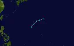 On January 16, the remnants of a weakening cold front to the east of the Philippines spawned an area of low pressure. The system became better organized as it moved to the northeast, however remained rather shallow. The low was absorbed by a cold front advancing from the north early on January 18, just to the north-northwest of Guam. Based on data from Chin's Atlas the system achieved typhoon strength between the 16 and the 18 of January,[2] however historical weather maps indicated the system never strengthened to a tropical storm.[3]