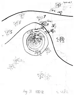 In late August, an area of disturbed weather persisted across the Bay of Campeche, eventually organizing into a tropical depression about 145 mi (233 km) northeast of Veracruz, Mexico by 00:00 UTC on August 24. The system gained steady strength on its north-northwest course, becoming a hurricane early the next day and attaining peak winds of 115 mph (185 km/h) – the first major hurricane of the season – southeast of Corpus Christi, Texas by 12:00 UTC on August 26.[2] At the time, the cyclone was thought to have possessed winds as strong as a 135 mph (217 km/h),[3] but this value was lowered in reanalysis. The hurricane made landfall along Matagorda Island, Texas at peak intensity by 12:00 UTC on August 27 and progressed inland, only slowly weakening to tropical storm intensity early the next morning. The cyclone curved northwest, ultimately dissipating southwest of the Dallas–Fort Worth metroplex around 18:00 UTC on August 29.[2]
