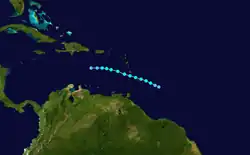 A tropical depression formed to the east of the Lesser Antilles on August 30. It moved steadily west-northwestward,[8] passing over Barbados as a weak tropical storm.[6] Seven people drowned on the island and 27 houses were destroyed in Bridgetown.[9] On Dominica, winds uprooted some trees, while rough seas damaged roads, jetties, and Landings.[15] After entering the Caribbean Sea on September 1, hostile conditions weakened the storm, and the third tropical cyclone of the season degenerated into a tropical wave on September 3 to the south of the eastern tip of the Dominican Republic.[8]