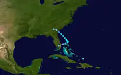 On October 3, a tropical storm developed near the southern coast of Cuba. It moved northwestward, crossing the island before turning to the northeast. Early on October 5, the storm brushed southeastern Florida,[8] producing gusty winds and rainfall. The threat of the storm prompted small craft warnings from the Florida Keys through South Carolina.[33] As it accelerated northeastward, the storm strengthened slightly to maximum sustained winds of 45 mph (75 km/h), before becoming extratropical on October 6. Two days later, the remnants moved over Atlantic Canada with winds of 70 mph (120 km/h),[8] producing flooding rainfall that washed out several roads. The storm caused two deaths after it wrecked a boat in Broad Cove, Nova Scotia.[34] Later, the cyclone passed south of Greenland before dissipating southwest of Iceland on October 10.[8]