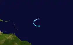 A vigorous tropical wave spawned a possible tropical depression on August 28 near the Cape Verde islands. A weather station on the island of Sal recorded a minimum central pressure of 1,004 mbar (29.6 inHg) on August 31. Ships in the area reported winds as strong as 46 mph (74 km/h) as the storm moved through the islands.[5] However, the ship and land data was insufficient to establish whether the system had developed a closed low level circulation. It maintained a general westward track, eventually dissipating on September 6 to the northeast of the Lesser Antilles.[3]