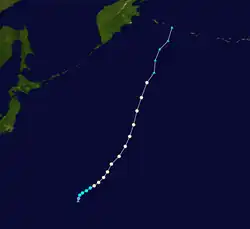 Tropical Storm Alice developed on July 14 in the open western Pacific Ocean. It moved to the northwest and attained typhoon status on the 16th. Alice rapidly intensified on the 19th to a 150-mile-per-hour (240 km/h) super typhoon, and after turning to the northeast it weakened. Alice hit southeastern Japan on the 22nd, and became extratropical on the 24th near the Kamchatka Peninsula.[5]