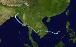 • Storm crossed 100°E and entered the Northern Indian Ocean cyclone basin. This system ultimately developed into a very severe cyclonic storm, designated Cyclone 10B by the JTWC, with three-minute sustained winds of 120 km/h (75 mph) before striking East Pakistan (modern-day Bangladesh). There, the storm damaged or destroyed roughly 35,000 homes and killed an estimated 3,000 people.[24]