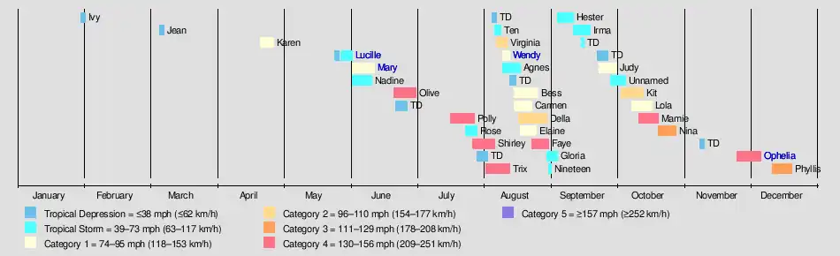 Following the 1960 season, Lucille and Ophelia's names were retired. The former was removed in light of the considerable loss of life in the Philippines; the latter was stricken due to its unusually long track. These were the first two names to ever be removed from the rotating naming list in the basin, though they were not replaced (although the names Lucy and Ora took their places in 1962 and 1963 respectively).[5]