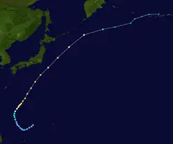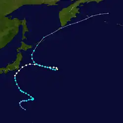 The most unusual tropical cyclone of the year began its life on November 21 in the open Western Pacific. The depression drifted, first to the west, then to the southeast, then back to the west, varying between a tropical depression and an open trough of low pressure. After a northward turn, it strengthened into a tropical storm on the 27th and turned back to the southwest. Ophelia turned to a west drift, and under favorable conditions, intensified into a typhoon on the 29th. It continued to strengthen as it crossed over the Caroline Islands, and became a super typhoon on the 30th. A day later it reached a peak of 155 mph (249 km/h), but a northward turn weakened it to 150 mph (240 km/h). Ophelia remained a Category 4 typhoons until December 4, when it began accelerating to the northeast over unfavorable conditions. After weakening to a tropical storm on the 6th, Ophelia became extratropical over the Northern Pacific Ocean. As an extratropical storm, it persisted until dissipating south of Alaska on the 8th. Ophelia brought heavy rains to the Caroline Islands, killing 2 and injuring 4. Many of the islands were covered in up to 2 feet (0.61 m) of water, and they experienced severe damage from Ophelia's strong winds. The name Ophelia was retired after this storm. Over the course of Ophelia's life, it traveled 5,000 miles.[16]