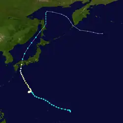 On August 10, a trough extending from Typhoon Virginia developed abnormal wind directions, prompting the JTWC and JMA to designate it a tropical depression. It quickly strengthened into Tropical Storm Wendy west of Iwo Jima. Wendy intensified, becoming a typhoon south of Shikoku and peaking offshore. It made landfall on Shikoku, then southern Honshu, weakening over land. After briefly reemerging over the Sea of Japan, it made a final landfall on northern Honshu before the JTWC discontinued advisories and the JMA declared it extratropical.