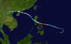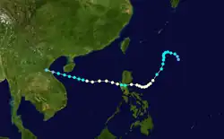 A large circulation over the Western Pacific organized into a tropical depression on October 2. It moved westward, steadily strengthening to a peak of 100 mph (160 km/h). Kit made landfall on the eastern Philippines at that intensity on the 6th and quickly crossed the archipelago. It turned to the northwest over the South China Sea and struck eastern Hainan Island on the 11th. Kit turned to the southwest, and after weakening hit northeastern Vietnam as a minimal tropical storm on the 13th. Kit dissipated shortly thereafter.