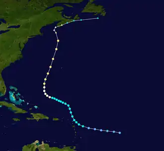 On September 29, reconnaissance aircraft indicated the formation of a tropical depression to the east of the Lesser Antilles. For several days it moved to the west-northwest, passing just north of the islands without intensifying further. This was due to its presence beneath an upper-level trough, although the system began intensifying as the trough dissipated. On October 2, after turning to the northwest between two high-pressure areas, the depression strengthened into Tropical Storm Daisy. Developing an anticyclone aloft, the storm continued to gradually intensify, reaching hurricane strength on October 3.[6] Two days later, Daisy turned to the north-northeast and attained peak winds of 105 mph (165 km/h). Cool air imparted weakening as Daisy turned northwestward, and on October 7, the storm transitioned into an extratropical about 185 mi (300 km) east of Chatham, Massachusetts. On the following day, the extratropical remnants of Daisy struck Nova Scotia just south of Yarmouth and later re-emerged into the Atlantic, before dissipating south of Newfoundland on October 9.[3]