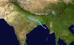Very Severe Cyclonic Storm Twelve developed on November 26. It was the strongest tropical cyclone of the season, peaking with winds of 140 km/h (85 mph). The system dissipated on November 29.[17] The storm moved from east to west and made a Tropical Storm-equivalent landfall on eastern India.