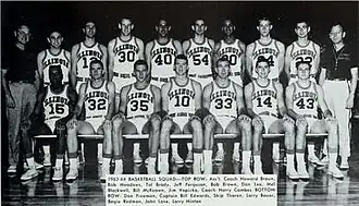 The 1963-64 team utilized several returning lettermen including the leading scorer and team "MVP" Skip Thoren. It also saw the return of team captain Bill Edwards, juniors Tal Brody, Bogie Redmon, Bill McKeown as well as sophomores Don Freeman, Jim Vopicka and Larry Hinton to their lineup. The Illini finished the season with a conference record of 6 wins and 8 losses, finishing in a 6th place tie in the Big Ten. They would finish with an overall record of 13 wins and 11 losses. The starting lineup included Skip Thoren at the center position, Tal Brody and Jim Vopicka at guard and Don Freeman and Bogie Redmon at the forward slots.[1]
