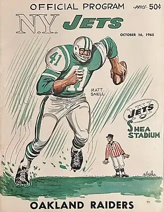 The Jets changed their primary logo in 1965, reversing the colors and slightly enlarging the helmet decal, which was now solid green with white lettering ("JETS" in thick sans-serif italics in front of "NY" in outline serif lettering) and a white miniature football at bottom center.