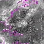 An area of convection persisted on October 16 between the Lesser Antilles and Cabo Verde. It moved west-northwestward for several days, developing into Tropical Depression Twenty-Two on October 19 about 500 mi (800 km) northeast of the Lesser Antilles.[2][4] The S.S. Sunrana moved through the storm on October 20, reporting winds of 58 mph (93 km/h). At the time, the system was not named due to the lack of a warm thermal core,[4] although it was later assessed as a tropical storm as of 18:00 UTC that day.[6] On October 21, the Hurricane Hunters observed a weak circulation with winds of only 35 mph (56 km/h). At the same time, the storm was located along the edge of a baroclinic zone, which limited strengthening. Curving northeastward due to an approaching trough, the storm intensified more on October 22, as a ship reported winds of 70 mph (110 km/h). That day, data from the Hurricane Hunters observed a warm core,[4] and the NHC classified the system as Tropical Storm Heidi. The storm was more of a hybrid storm initially,[19] with the strongest winds near the center, spurring gale warnings for Bermuda.[20] However, winds there only reached about 15 mph (24 km/h) during the storm's passage.[21]