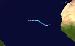 A tropical wave exited Senegal on September 18 and progressing westward near Cabo Verde. A day later, it developed into Tropical Depression Fifteen. It moved across the Atlantic, dissipating on September 27 after entering the eastern Caribbean.[3]