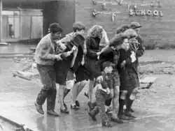 At the high school, following the tornado's passage, numerous survivors recall seeing students covered in mud, some having pieces of debris such as road tar ingrained into their skin.[4] Survivors recall doors from around the building had been removed from their hinges and used as stretchers to transport the deceased to the gym,[4] where a "makeshift morgue" had been established for the dead. Injured students and staff were put on tables outside of the gym, before being taken to hospitals across Belvidere and neighboring Rockford.[12] Tornado expert Thomas P. Grazulis ranks the 13 fatalities at Belvidere High School as the sixth deadliest tornado event at a school and the worst after 1955.[9]