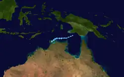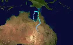 Bronwyn formed in the Gulf of Carpentaria and made landfall in Queensland on 7 January north of Weipa. Half of Queensland received more than 50 mm (2.0 in) of rain, with Paluma, Queensland receiving 1,270 mm (50 in) in 48 hours. Serious flooding occurred during the storm. The Burdekin River flooded Ayr and Home Hill.[3]