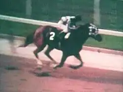 Out of the starting gate, Secretariat and Sham raced evenly through the first turn.[7][16] Through a half-mile, the two were even.[16] Entering the backstretch and approaching three-quarters of a mile, Secretariat began to distance himself as Sham began to fade, ultimately finishing last.[17] Approximately 11 days after the Belmont Stakes, Sham suffered a hairline fracture in his right front cannon bone during training,[18] which ended his racing career.[19]